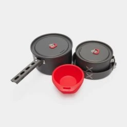 A hard, anodised aluminium pan set which stacks inside itself for easy storage and compact carrying.