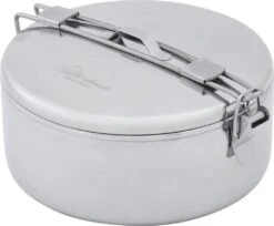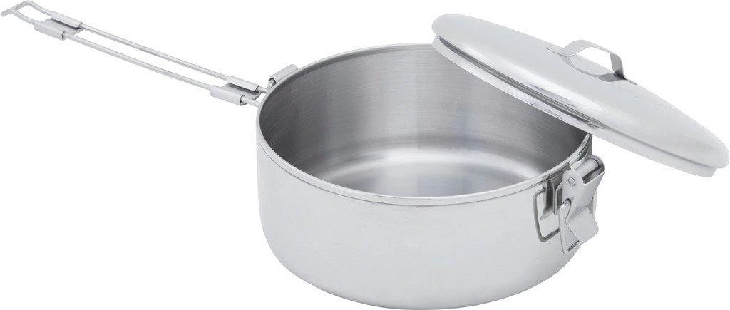 A great piece of cookware for when you are tight on space. The Stowaway Pot from MSR is durable and has a long handle which locks into place and then folds up on top of the pot when you are done cooking.Â