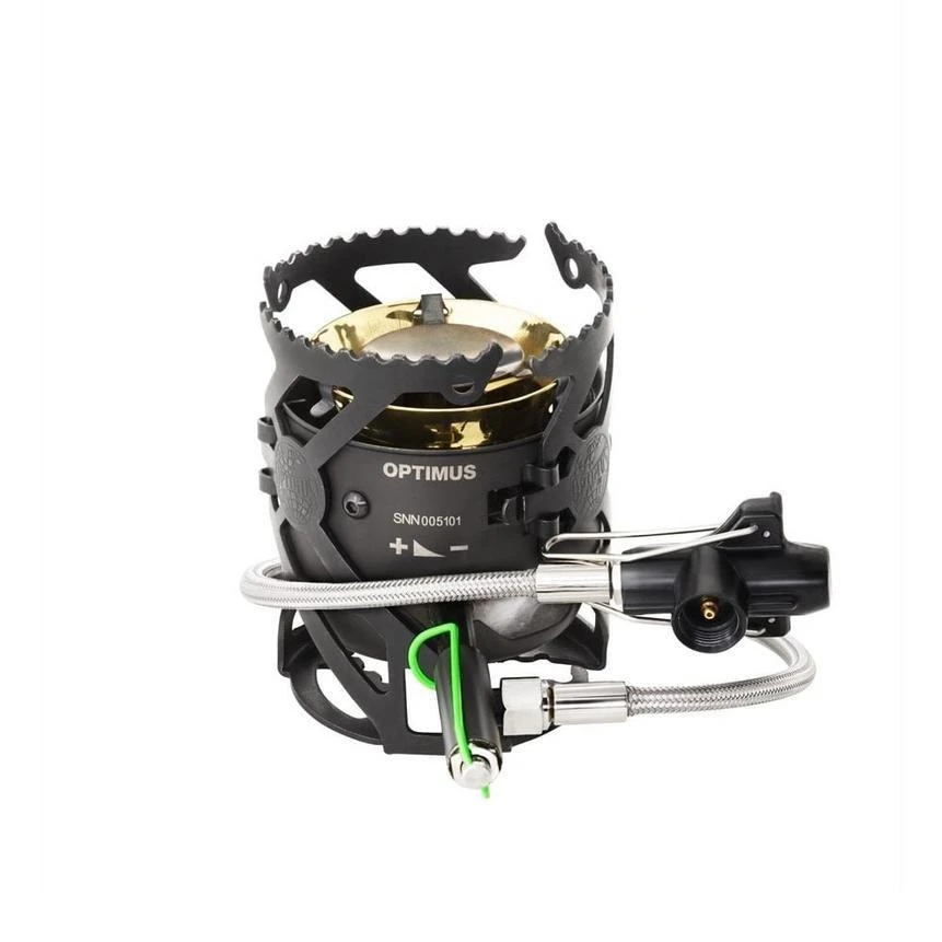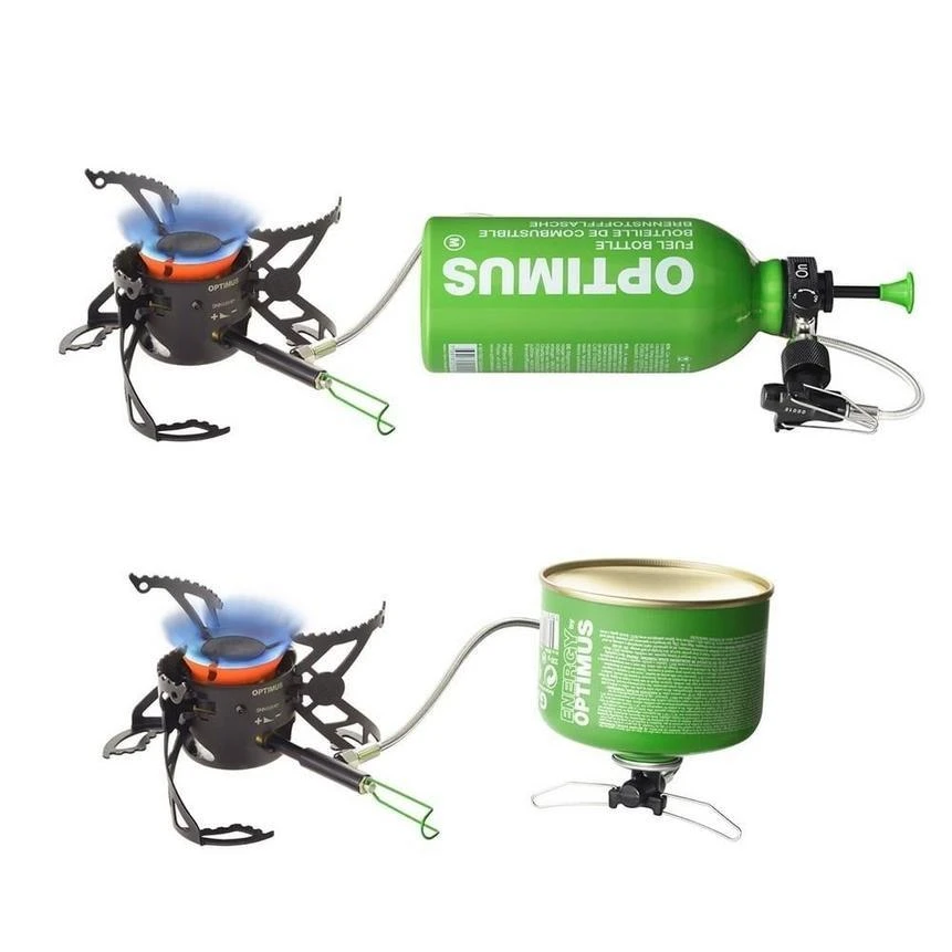 The Optimus Polaris Optifuel is the new benchmark for maximum versatility and ease of use in outdoor cooking. With its single jet technology it delivers excellent cooking performance with LPG Gas, White Gas, Kerosene, Diesel and Jet Fuel without having to change anything on the stove. The patented quick-priming burner, the self purging aluminium pump and a built in magnetic cleaning needle ensure reliability and ease of use when liquid fuels are used. When using LPG gas, you can switch between efficiency mode and 4 season mode (for usage at low ambient temperatures) by simply opening the integrated support legs and turning the canister upside down.