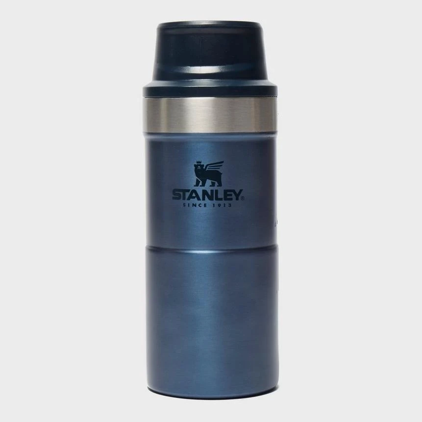 The Stanley 0.35L Travel Mug is a single serve vacuum mug that easily opens with a button push.