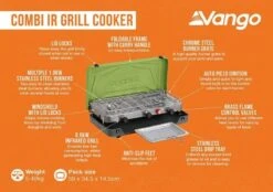 Vango’s Combi IR Grill camping stove is built for the keen campsite chef! The stove features two 1.9KW stainless steel burners, both with independently operational brass heat control values, allowing simultaneous use of different heat levels for varying foodstuffs.