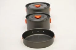 Your cooking tastes better outdoors, so treat yourself to dinner out! These Vango Hard Anodised Cook pots are ideal for whipping up a quick meal for one. The small pot has dual purpose, as a pot and as a lid for the larger pot. The hard anodised construction and heat-resistant handles are durable, easy to use, and easy to clean. The whole kit is lightweight and nestles into itself for easy transportation and storage. The set Includes two lightweight, non-stick pots and a convenient storage bag.